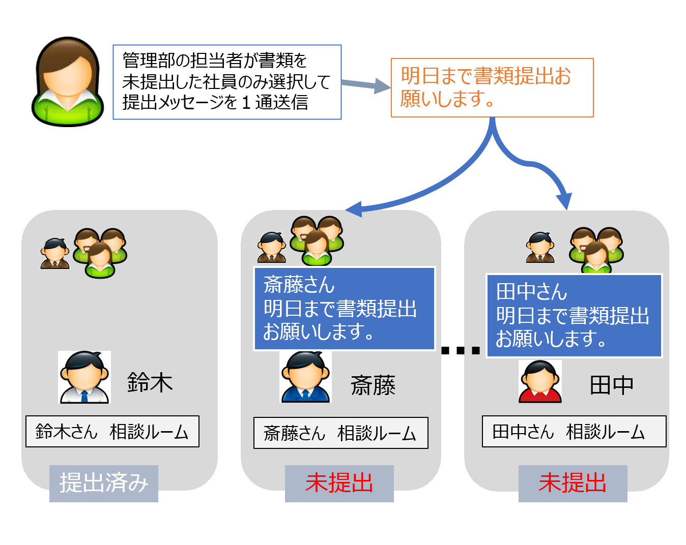 送信メッセージの件と関係がある社員にだけ送られるので、無駄なメッセージがなくなります。